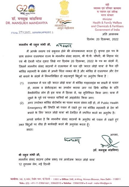 Amid rising covid cases cross the world, Union Health Minister requested Rahul Gandhi who is presently busy in Bharat Jodo yatra to follow all the covid related protocols in order to be safe. the Congress hit back at the government on Wednesday, accusing it of selectively targeting its programme.In a letter addressed to Rahul and Rajasthan Chief Minister Ashok Gehlot on Tuesday, Mandaviya wrote: “Please ensure that in the ongoing Bharat Jodo Yatra in Rajasthan, all Covid-19 guidelines are strictly followed, masks and sanitizers are used, and only those vaccinated against Covid-19 participate. People must isolate themselves before and after they join the yatra… If it is not possible to follow these Covid-19 protocols, then, keeping the public health situation in mind, please suspend the Bharat Jodo Yatra in the national interest…” Also read : As Covid cases spike in China, experts ask Indians to stay safe :If talking about the present location of the yatra, Yatra completed its