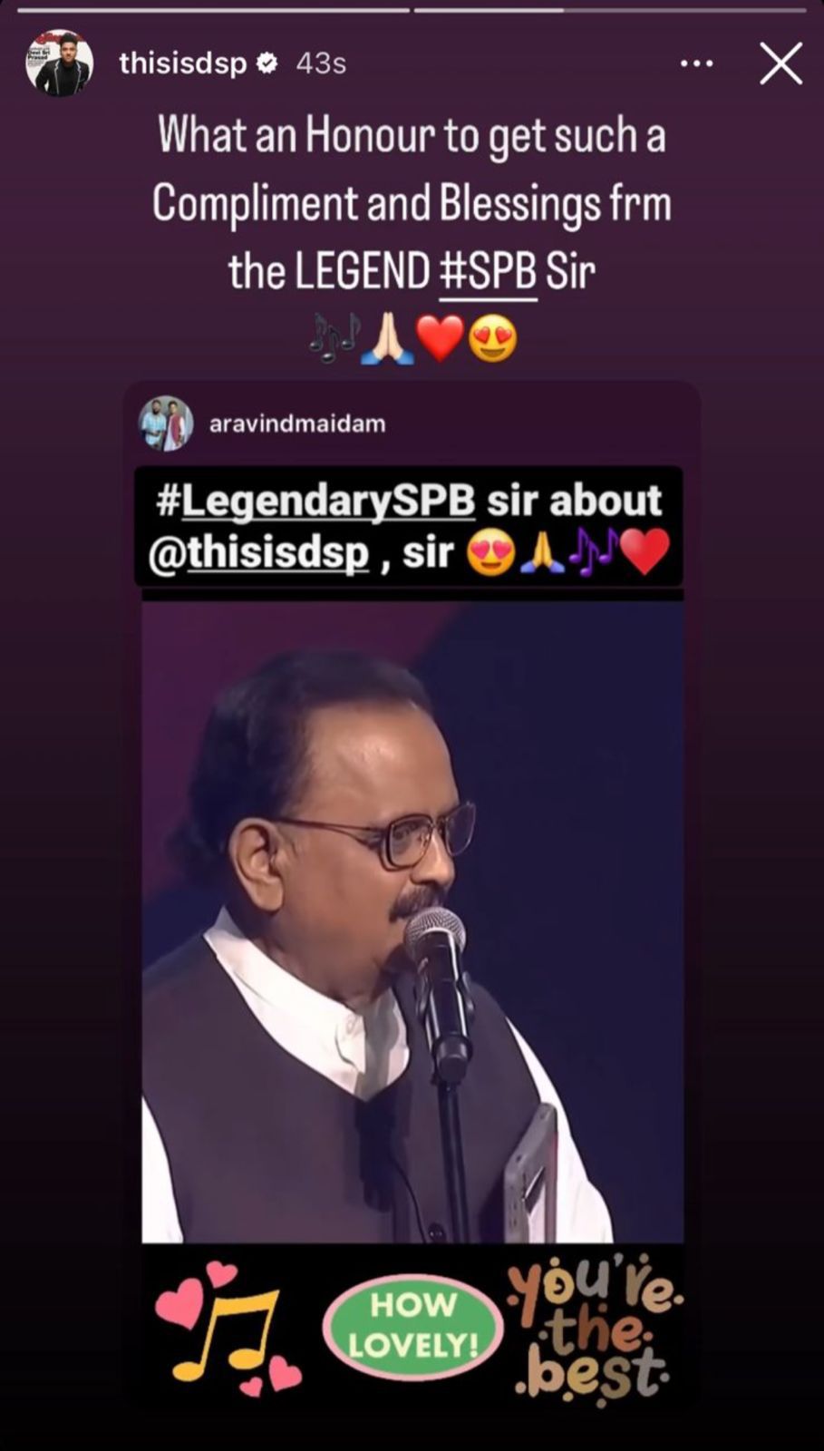Sharing it, DSP wrote, “What an honour to get such a compliment and blessing from the legend SPB sir.”