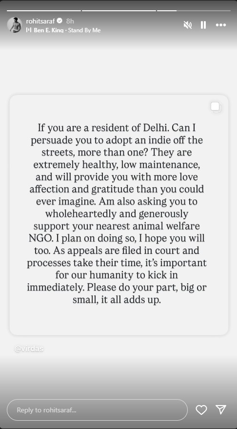 On August 11, the Supreme Court ordered the removal of all community dogs from Delhi-NCR, ordering the authorities to keep animals in shelters amid the rising cases of dog attacks and rabies. As many celebrities came out to voice their concerns, Rohit Saraf also joined by sharing a strong note on his social media. Also Read: Taali Star Sheetal Kale Urges Compassion for Stray Dogs Amid Supreme Court Order Stand-up comedian and actor, Vir Das took to his social media handle to share a post, urging citizens to adopt indies and support animal welfare NGOs. Rohit Saraf reshared the post on his social media, extending support in improving the condition of community dogs and preventing them from facing something much worse. The note read, “If you are a resident of Delhi, can I persuade you to adopt an indie off the streets, more than one? They are extremely healthy, low-maintenance, and will provide you with more love, affection, and gratitude than you could ever imagine. Am also asking you to wholeheartedly and generously support your nearest animal welfare NGO. I plan on doing so, I hope you will too. As appeals are filed in court and processes take their time, it's important for our humanity to kick in immediately. Please do your part, big or small, it all adds up.”