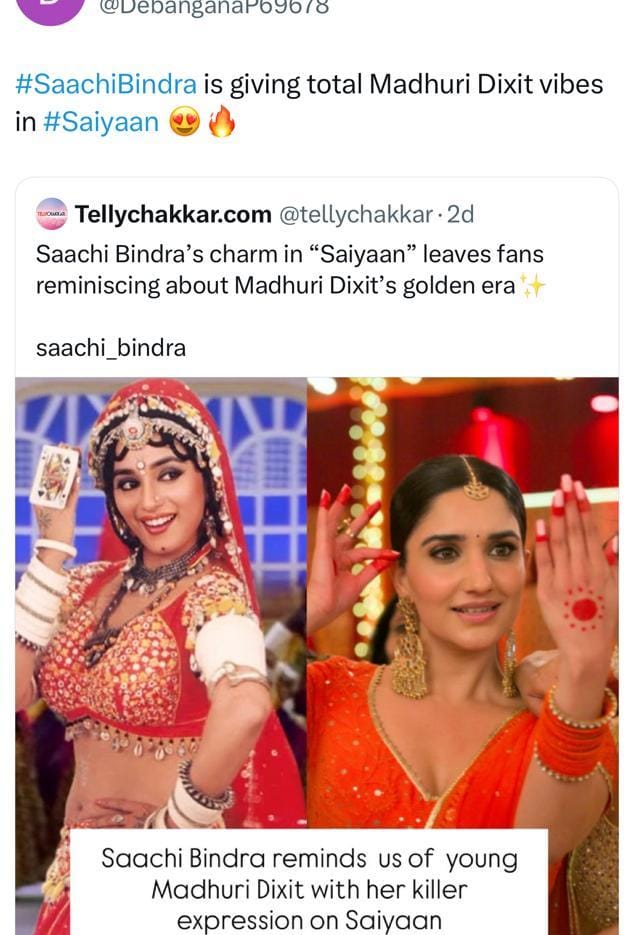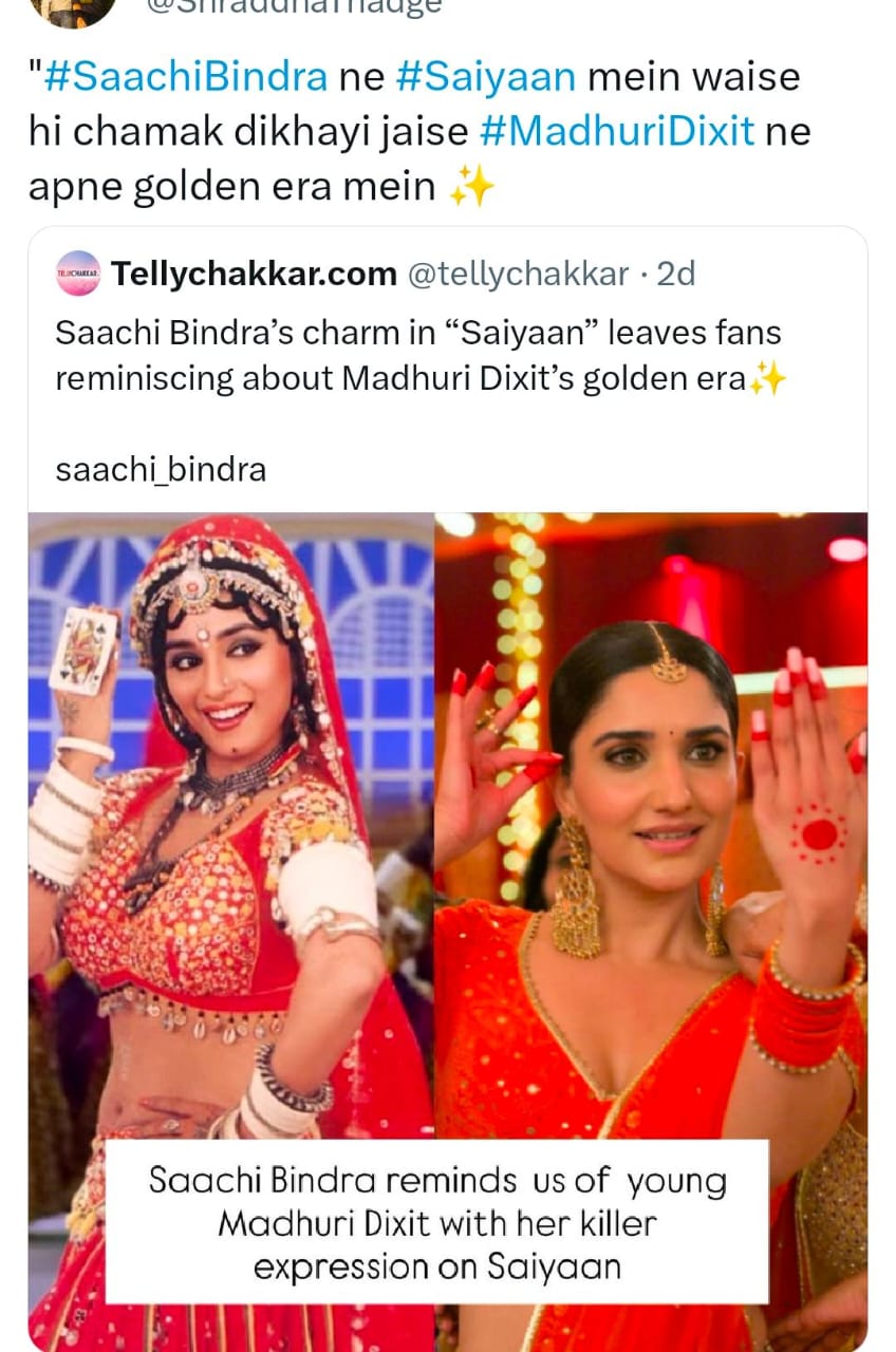 A user wrote, “Full #MadhuriDixit vibes! #SaachiBindra is killing it in Saiyaan!” and another added, “#SaachiBindra ne #Saiyaan me waise hi chamak dikhayi jaise #MadhuriDixit ne apne golden era mein.” One more user commented, “#SaachiBindra’s expressions remind me so much of Madhuri ji’s golden era!”