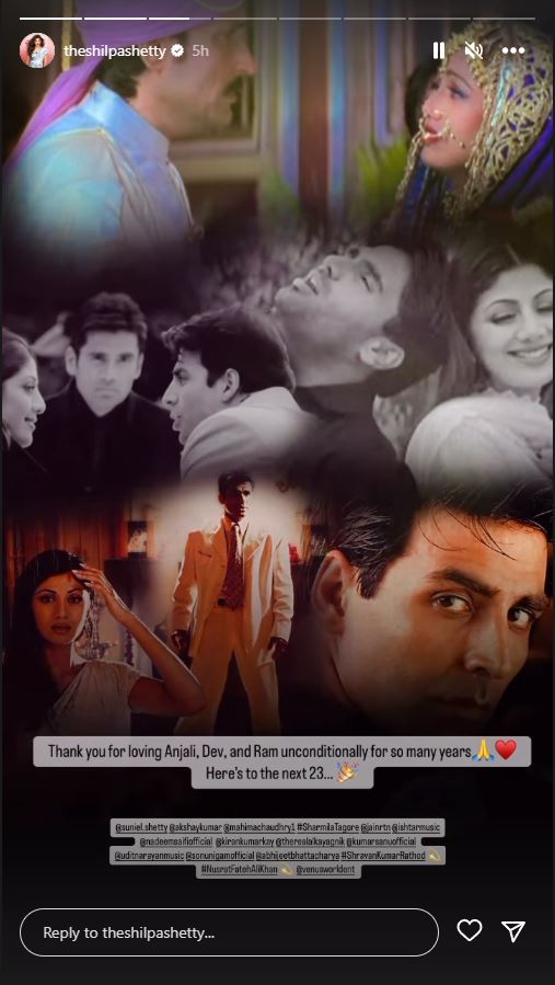 23 years ago, the Indian silver screen saw the birth of the timeless film "Dhadkan," a romantic drama directed by Dharmesh Darshan, which graced theatres on August 11, 2000. The film not only captured the hearts of millions but also catapulted its lead actress, Shilpa Shetty Kundrra, to stardom. Also Read: Sonu Sood's generosity shines as he lends Support To Bihar Man To Clear His Debts Actress took to her Instagram story and shared a glimpse of the movie ''Dhadkan" with the caption, "Thank you for loving Anjali, Dev and Ram unconditionally for so many years (heart emoji), here's to the next 23"