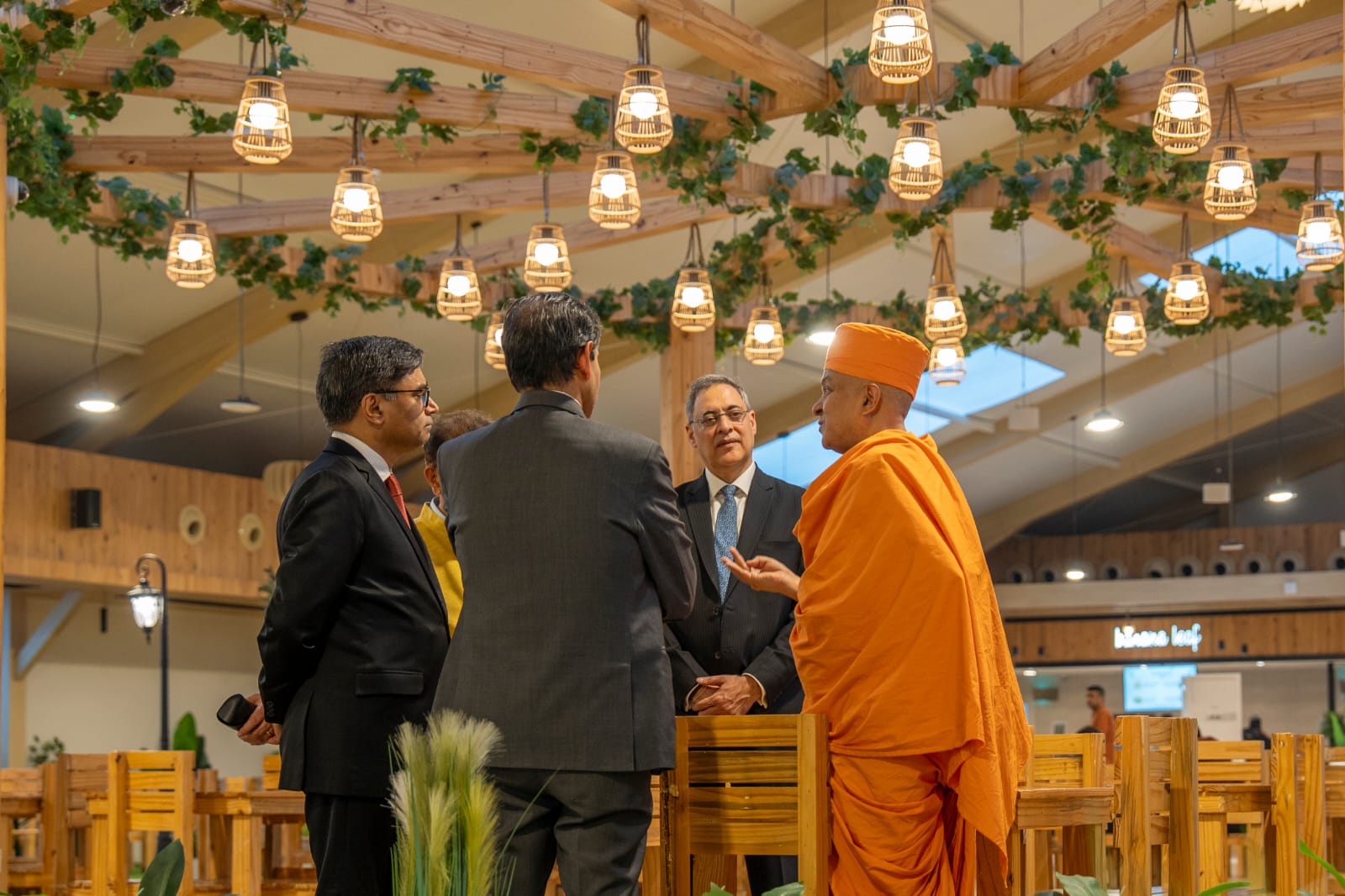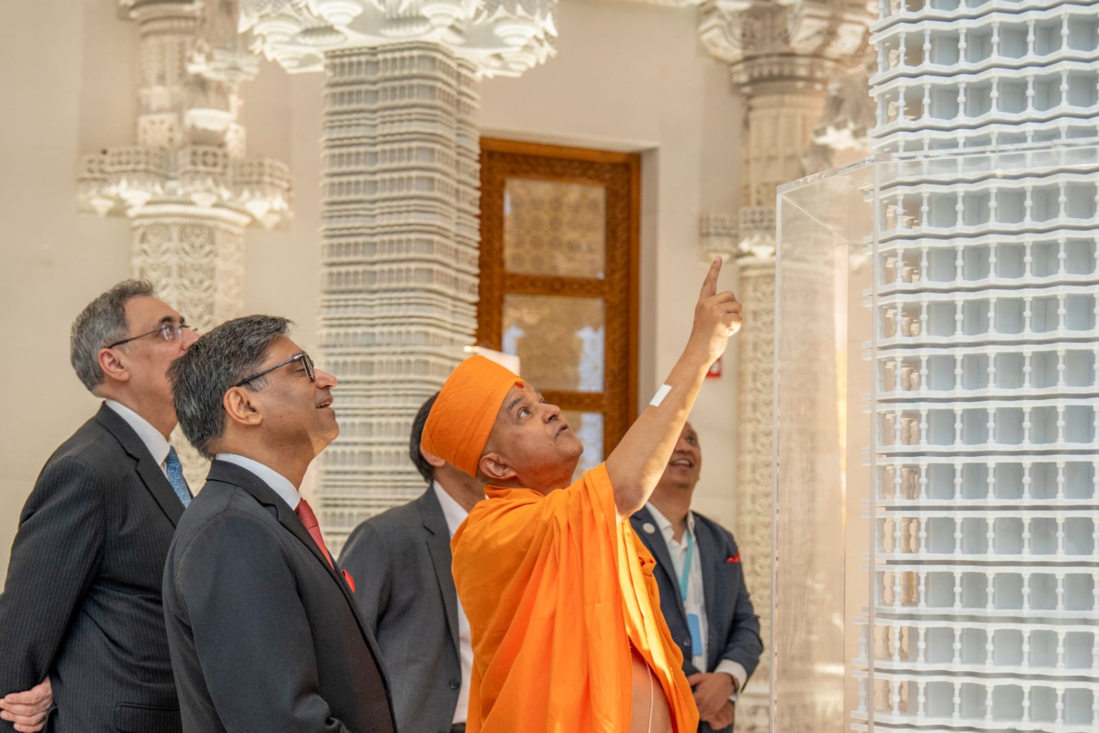 Swami Brahmaviharidas unfolded the profound symbolism woven into the Harmony Dome, illuminating its spiritual essence and universal message of harmony between the Divine and Humankind. He revealed that each aspect of the mandir evoked deep reflections in him, unravelling layers of thoughtful symbolism with its ornate craftsmanship. Within the sanctum of the mandir, he offered reverent prayers at the seven inner shrines and paused in contemplative homage to the visionary guidance and spiritual legacy of His Holiness Pramukh Swami Maharaj, whose divine foresight gave rise to this monumental beacon of faith and harmony.