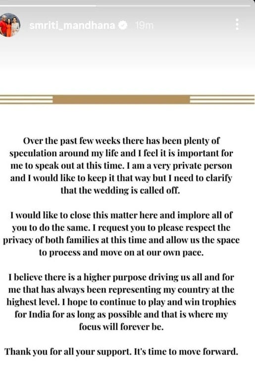 Smriti Mandhana wrote on Instagram, "For the past few weeks, there have been many things said about my life. I am a very private person and I want to keep my private life private, but it is now necessary to state that the marriage has been called off. I want this matter to end here. I request everyone to respect the privacy of both families and give us time to overcome this situation and move forward."