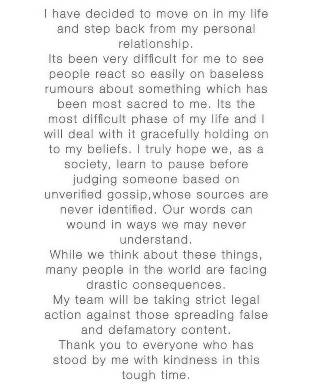 While we are discussing these things, many people in the world are facing serious challenges. My team will take strict legal action against all those who are spreading false and defamatory information. I thank all those who stood by me and showed me kindness during this difficult time."