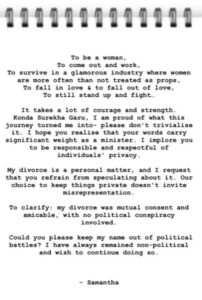 Samantha statement of this Meanwhile Samantha said that, surviving in an industry where women heroines are mostly used as props. Falling in love, falling, standing up and fighting... all this requires a lot of courage. Konda Surekha I am proud of my journey. Please do not spoil it. Hope you realize that as a minister your words matter. All though, I am requesting, you plz respect the privacy of others too. My divorce is my personal matter and Konda Surekha should not speculate about it. We kept it private, but that does not mean that false statements should be made. Let me tell you that my divorce happened with the consent of both of us. Keep your political matter away from my name.