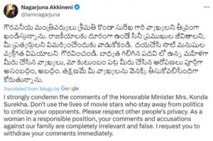 Nagarjuna files defamation case against Surekha Even though Nagarjuna asked Surekha to withdraw her statement Naga Chaitanya's father Nagarjuna also gave his reaction in this matter. He has instructed Surekha to withdraw her statement on social media and has also called her allegations wrong and basless.