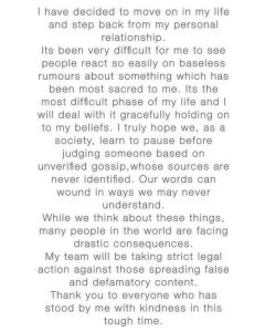 While we are discussing these things, many people in the world are facing serious challenges. My team will take strict legal action against all those who are spreading false and defamatory information. I thank all those who stood by me and showed me kindness during this difficult time."