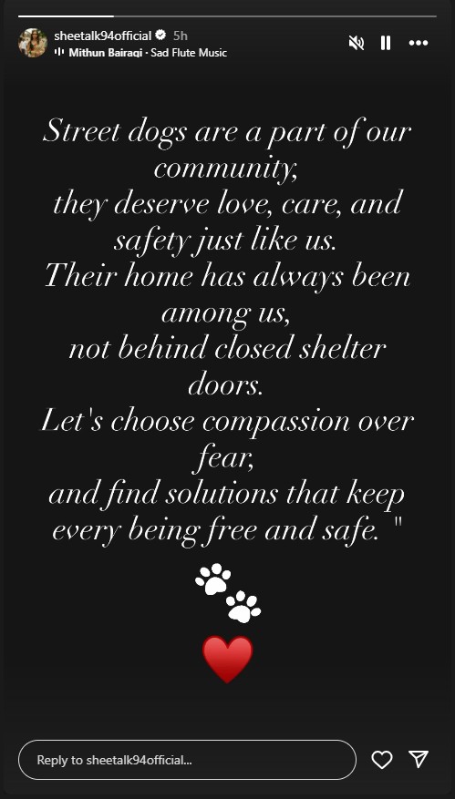 Joining the voices in support of street animals, Sheetal shared a heartfelt message on her Instagram account. Her post read: "Street dogs are a part of our community, they deserve love, care, and safety just like us. Their home has always been among us, not behind closed shelter doors. Let’s choose compassion over fear, and find solutions that keep every being free and safe." 🐾❤️