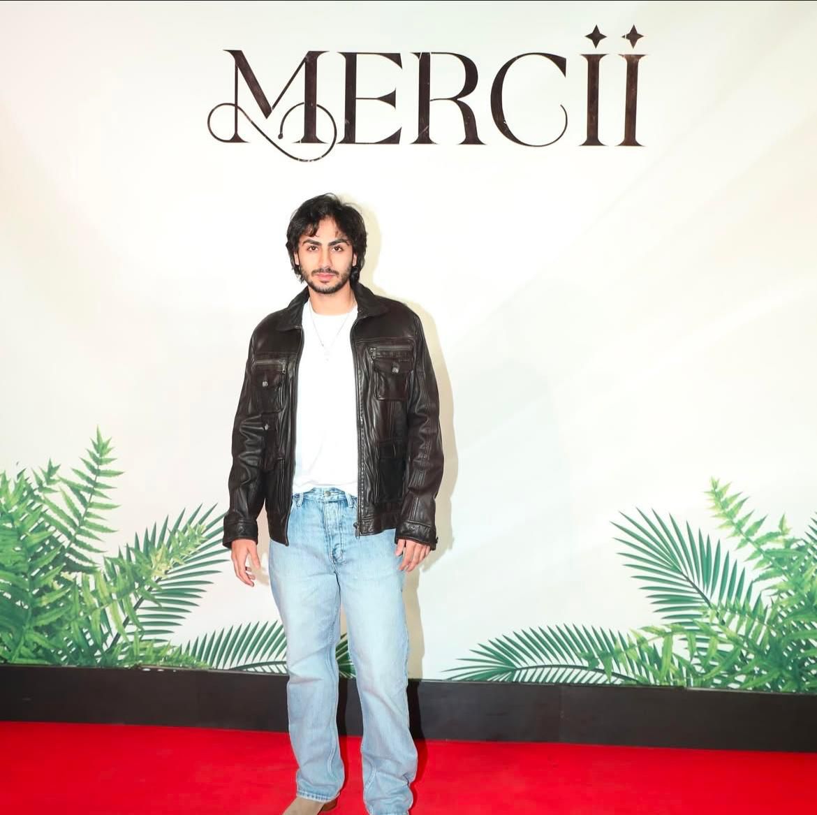 Arhaan Khan sported a blue denim bottom with a classic white t-shirt paired with a leather jacket. He completed his ensemble with contrasting grey shoes.