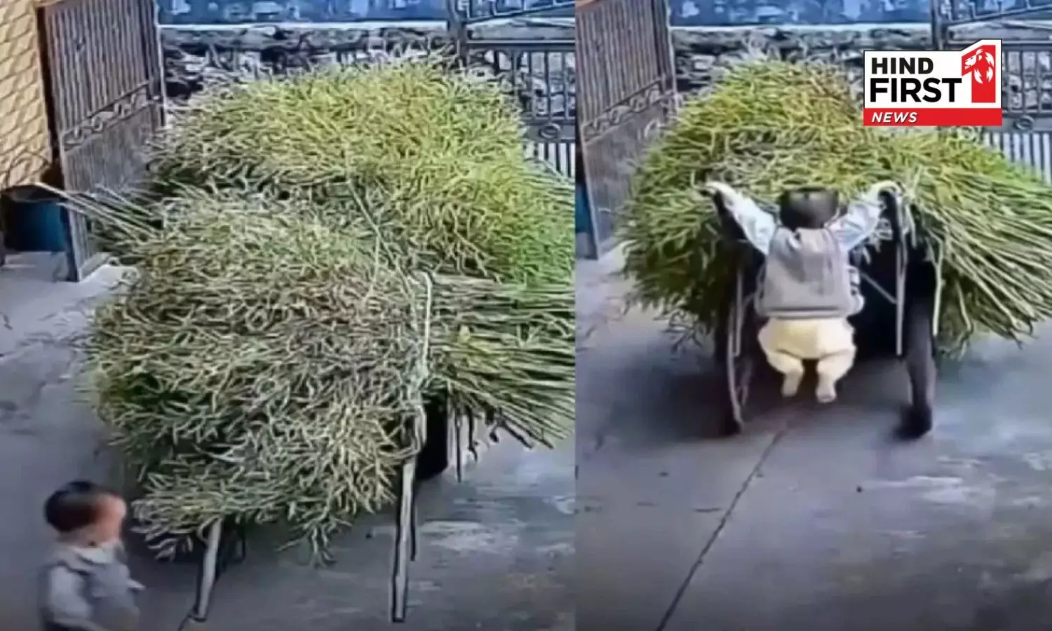 The video begins with a field-like area where a buggy (small cart) is loaded with mustard crops. The buggy is quite heavy, and its front end is slightly raised. The mother, standing nearby, is apparently busy with her work. Then, the little child, perhaps trying to imitate or help his mother, reaches out and tries to grab hold of the buggy. He feels the urge to help, but fails to realize that the weight of the buggy is beyond his control.