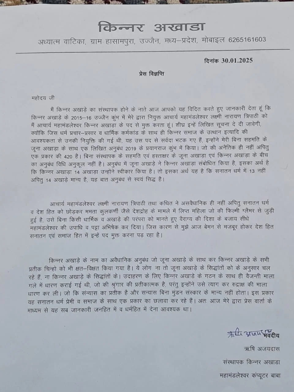 Rishi Ajay Das, who lives in Adhyatma Vatika in Hasampura, Ujjain, Madhya Pradesh, has suspended Mahamandaleshwar Laxmi Narayan Tripathi from Kinnar Akhara. He has also removed Mamta Kulkarni, who was made Mahamandaleshwar of Kinnar Akhara on 24 January, from the Akhara. With this, Kinnar Akhara has come into the limelight. Ajay Das claims that he was the one who established the Kinnar Akhara. But he is neither a Kinnar nor has he ever done any movement for Kinnars. Ajay Das claims that he had established the Kinnar Akhara in 2015 before the 2016 Simhastha. Ajay Das has removed Mahamandaleshwar Laxmi Narayan Tripathi of Kinnar Akhara from his post by making several allegations against her.